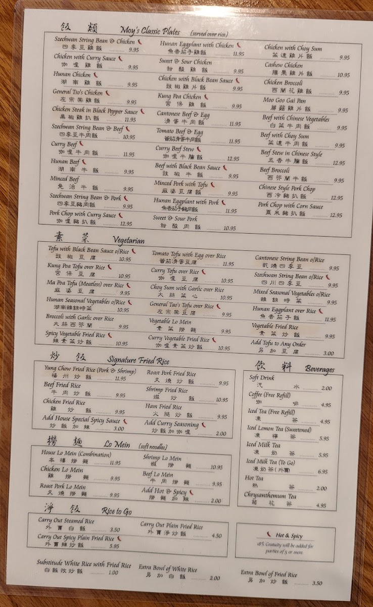 The menu at Moy's is a treasure trove of flavor ready to be discovered. Kick off your meal with tantalizing starters like the Vegetable Spring Roll and the signature Fried Wontons, delicately wrapped shrimp that beckon with every crispy bite. For those craving something hearty, the savory Pot Stickers, filled with tender pork and scallions, will surely warm your soul.